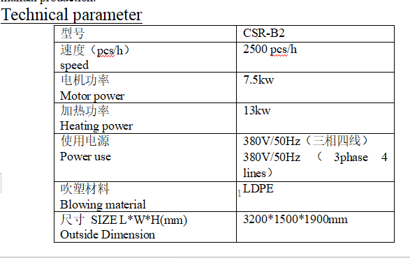 Máy thổi này áp dụng quy trình đúc thổi đùn trục vít được chuyển đổi tần số và kiểm soát nhiệt độ tự động. Là sự kết hợp giữa thiết bị điện, thiết bị khí nén và máy móc, nó có hiệu suất ổn định, dễ vận hành và phù hợp cho sản xuất thủ công.