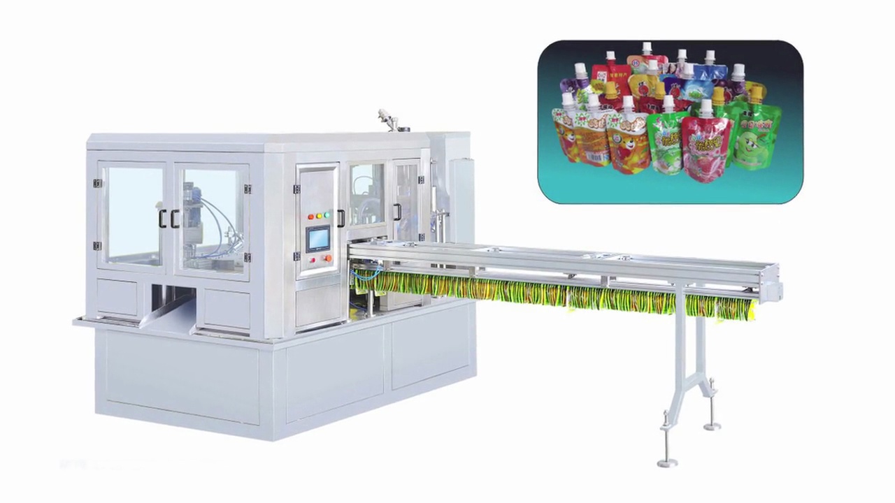 This machine is to fill and cap spouted stand-up pouch with jelly, juice, oil, water, detergent, cosmetics and other liquid or paste alike.