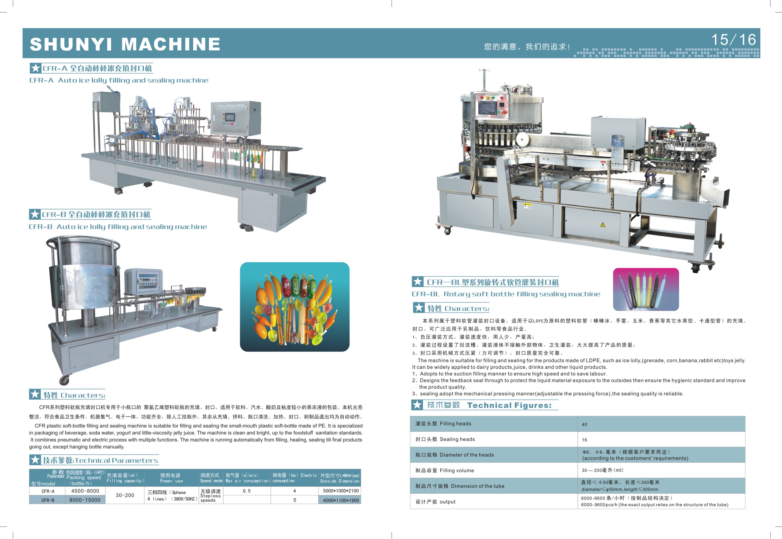 CFR plastic soft-bottle filling and sealing machine is suitable for filling and sealing the small-mouth plastic soft-bottle made of PE. It is specialized in packaging of beverage, soda water, yogurt and little-viscosity jelly juice. The machine is clean and bright, up to the foodstuff sanitation standards. It combines pneumatic and electric process with multiple functions. The machine is running automatically from filling, healing, sealing till final products going out, except hanging bottle manually.
